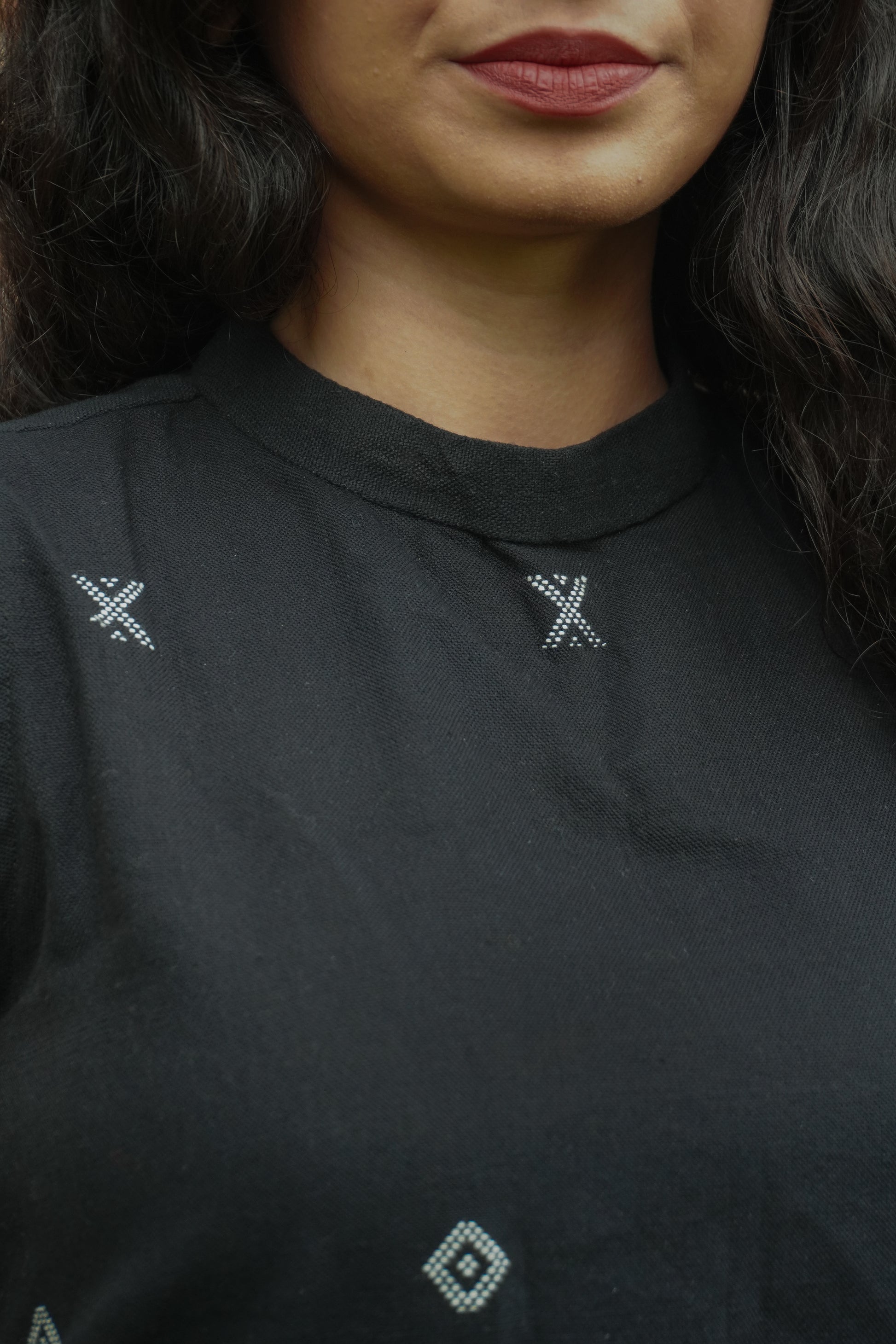 This black short kurti carries the rhythm of Kutch in every thread The deep, inky black echoes the desert sky just after sundown, while the subtle weave tells a story only the loom remembers ancient patterns passed through generations, now reimagined for the modern woman. Tailored in a relaxed, short silhouette, this kurti is made for movement and meaning whether you're walking through old city markets, escaping into nature, or simply choosing mindfulness in your everyday wardrobe